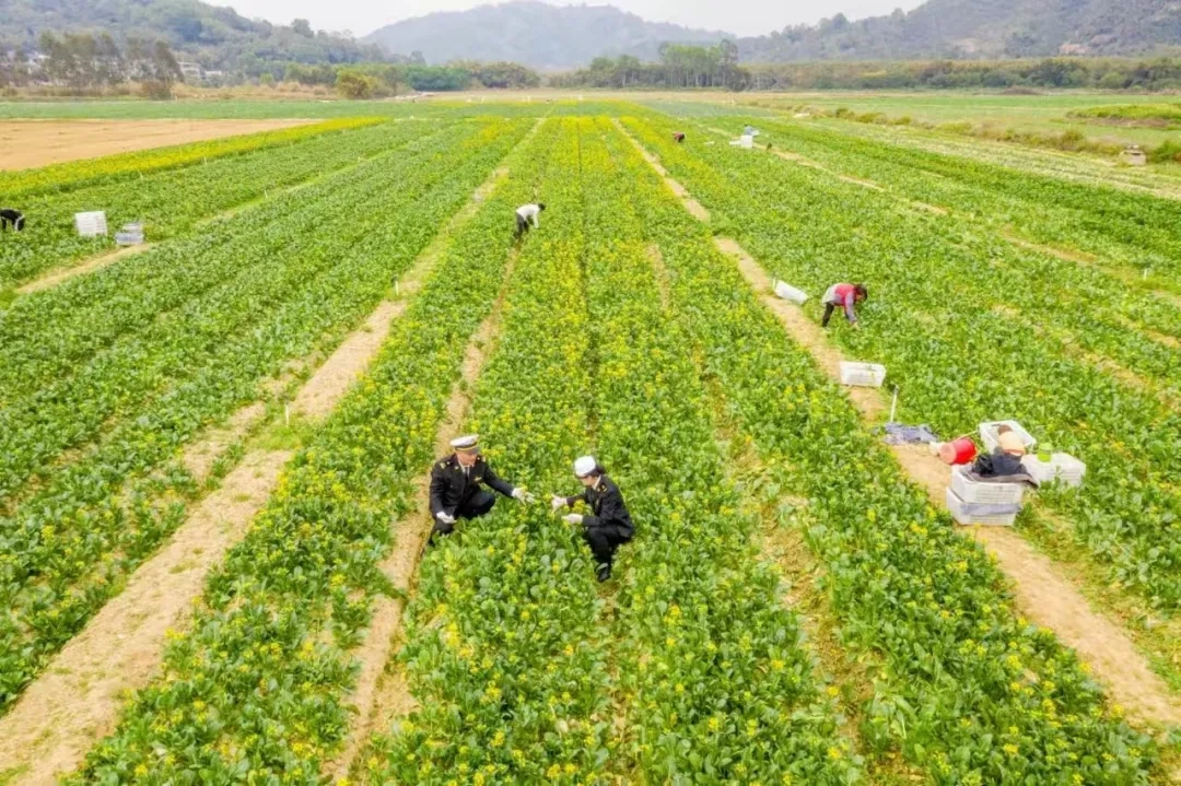 揭阳海关关员在供港蔬菜种植基地查看蔬菜长势情况(来源:坪上镇人民政府)