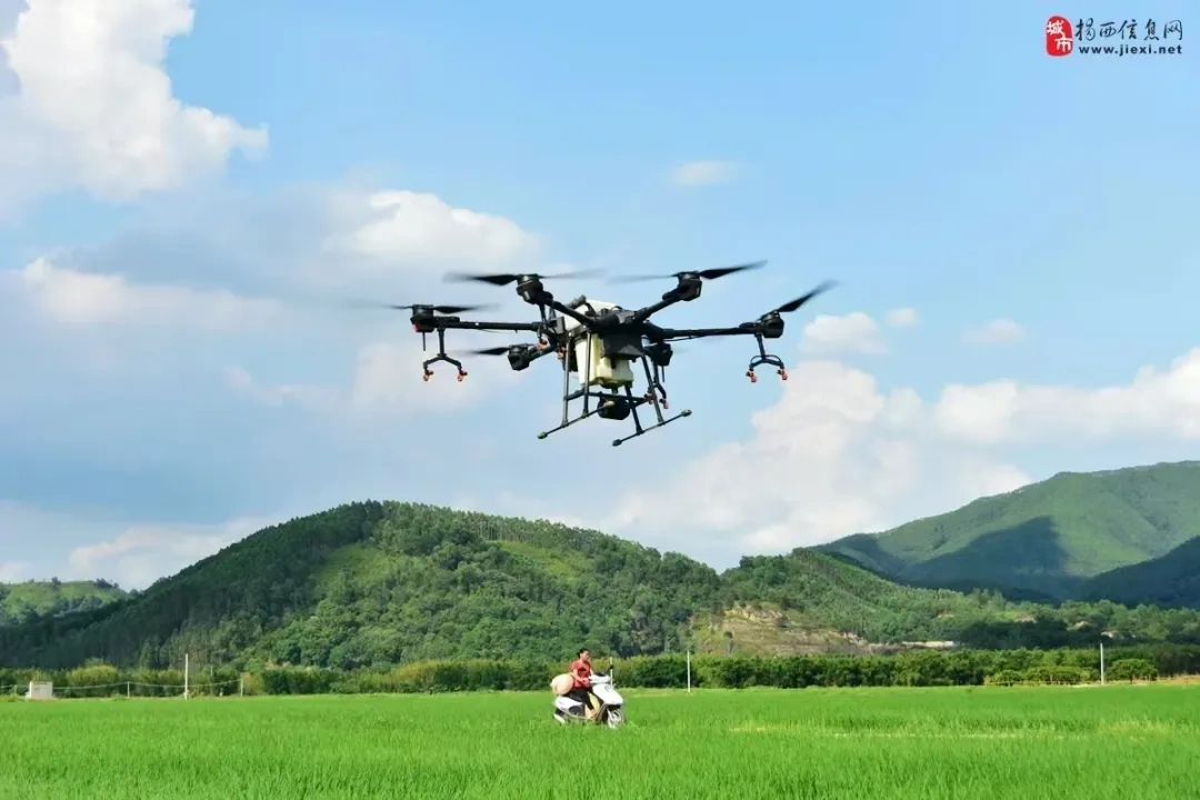 遥控无人机进行空中喷洒农药作业(来源:揭西信息网)
