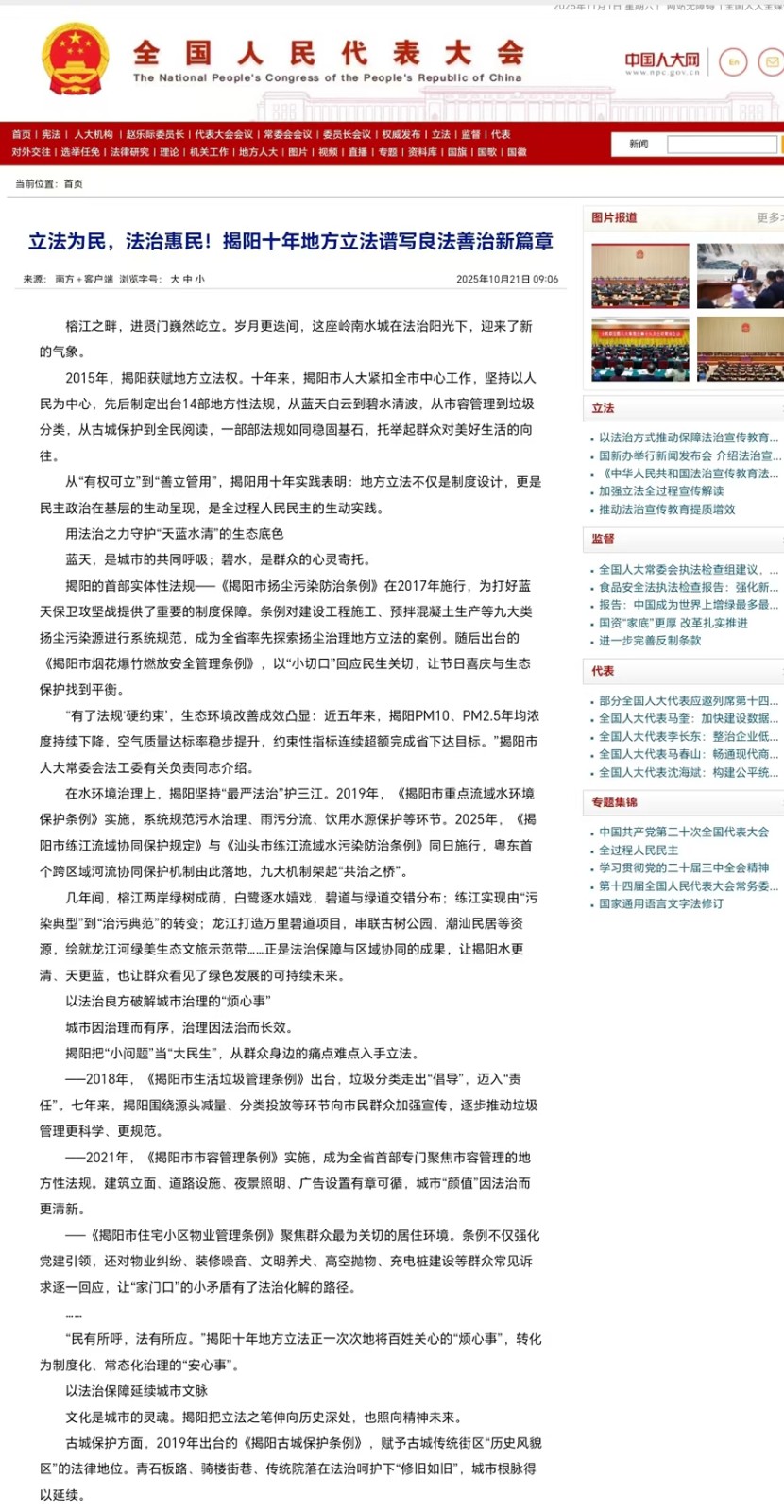 今年来,中国人大网转发揭阳人大工作5篇报道:《立法为民,法治惠民!揭阳十年地方立法谱写良法善治新篇章》《揭阳:基层立法联系点提质升级 立法工作迈向高质量发展》《揭阳榕城:代表“沉”下去 古城“活”起来》《揭阳揭东:玉湖镇人大代表进网格 环境“颜值”亮起来》《奋力推动民主根系深扎产业沃土——洪阳镇人大打造全过程人民民主实践样本纪实》。现将《立法为民,法治惠民!揭阳十年地方立法谱写良法善治新篇章》转发。