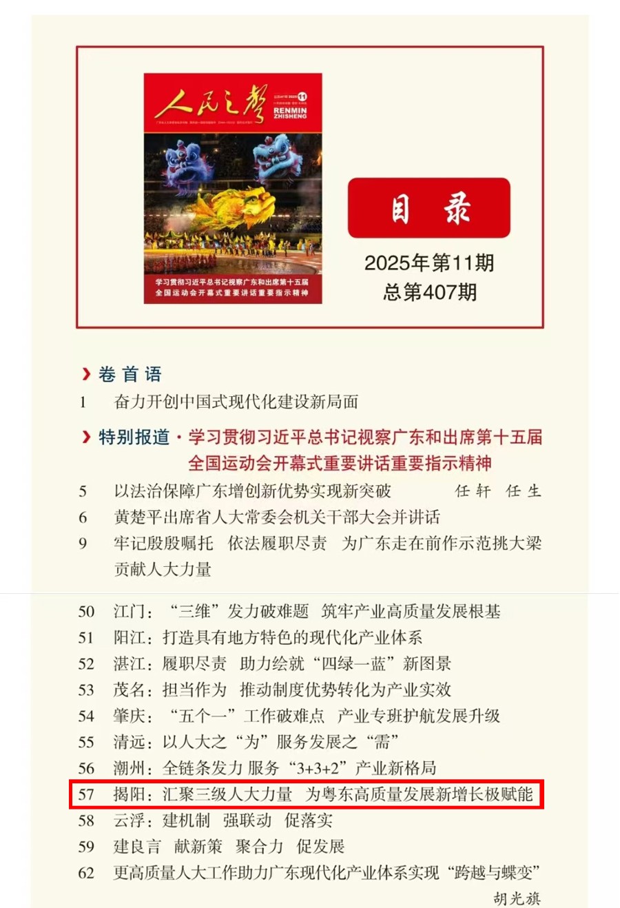 《人民之声》杂志第10期刊发了《揭阳市:三级人大联动发力 为蓝色经济注入“人大动能”》,又于第11期刊发了《揭阳:汇聚三级人大力量  为粤东高质量发展新增长极赋能》,连续两期报道了揭阳人大助力现代化产业体系建设的履职事迹。