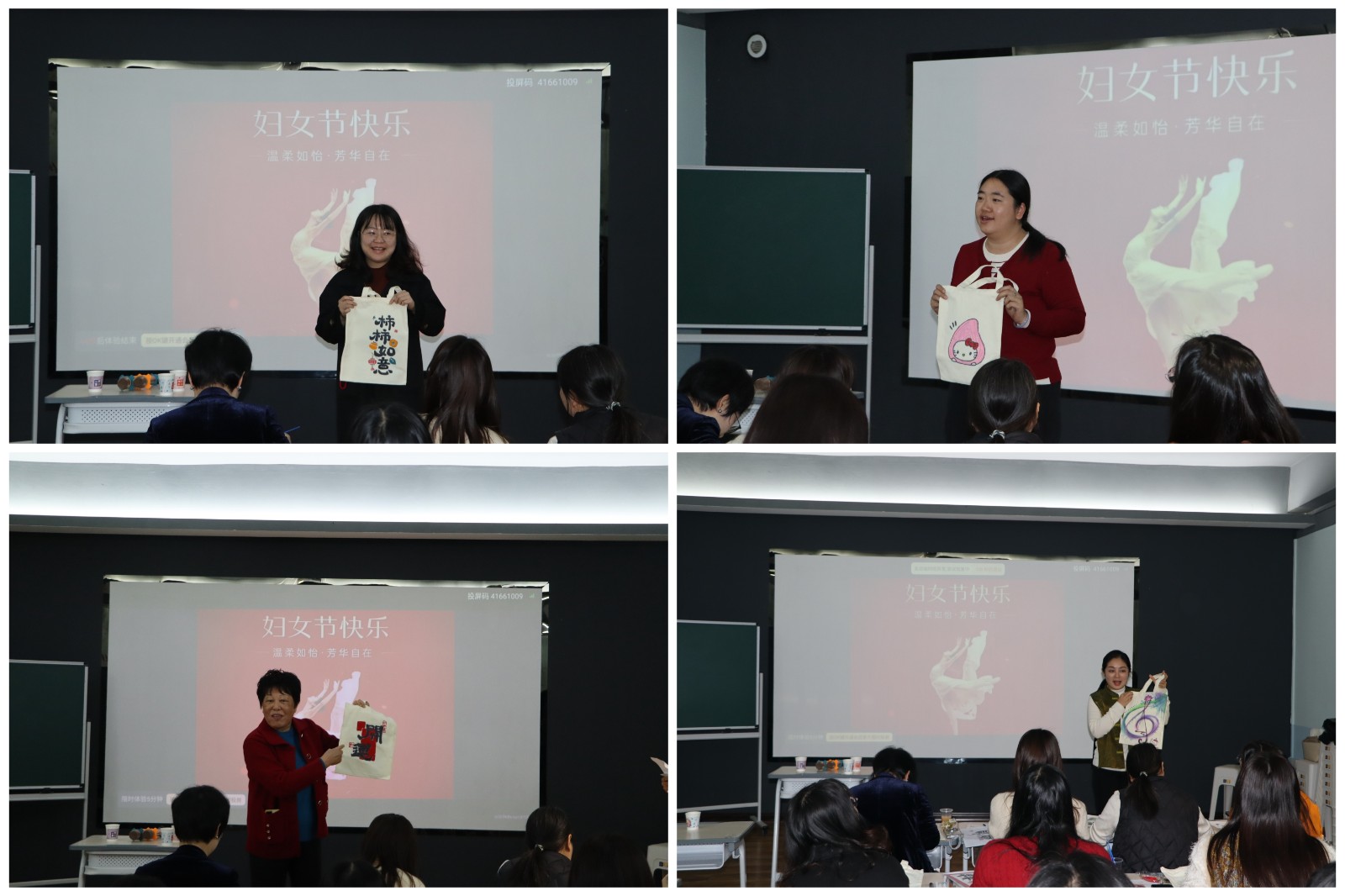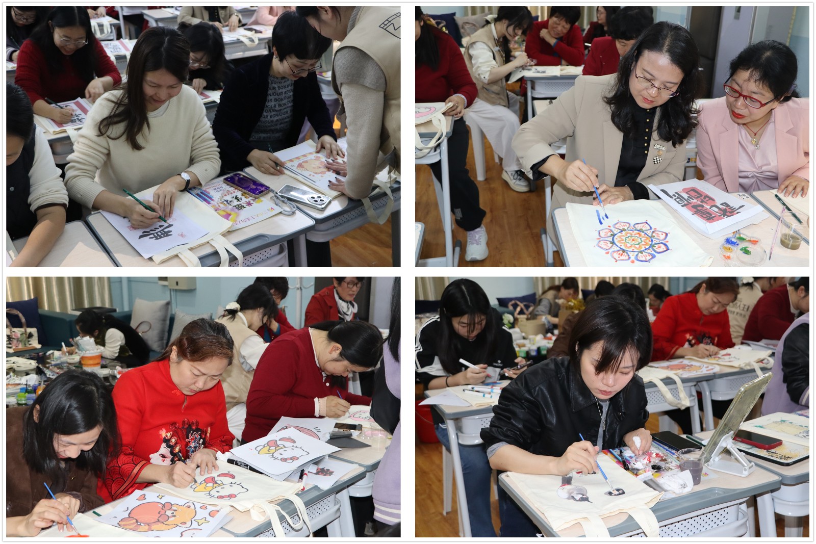 经过一个多小时的精心制作,一件件独具匠心、色彩斑斓的手绘购物袋作品精彩呈现。在随后的展示交流环节,会员们纷纷举起自己的作品合影留念,并轮流介绍创作灵感和寓意。每一幅作品都凝聚着女会员们对美好生活的热爱与追求,展现了她们 “内外兼修、刚柔并济” 的独特魅力。