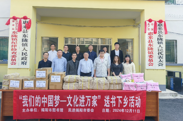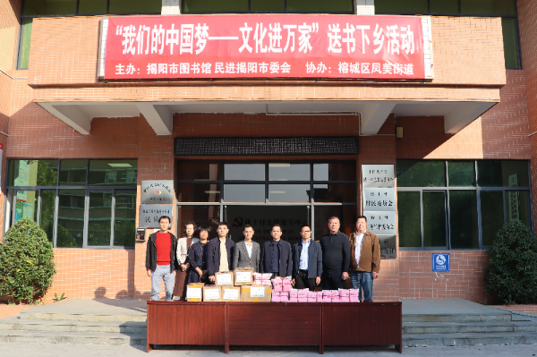为发挥民进文化界别优势,助力擦亮“书香揭阳”名片,助推“百千万工程”深入推进,12月11日和19日,民进揭阳市委会联合揭阳市图书馆分别到惠来县和榕城区举办“我们的中国梦——文化进万家”送书下乡活动。民进揭阳市委会副主委孙捷敏、刘特鹏参加活动。