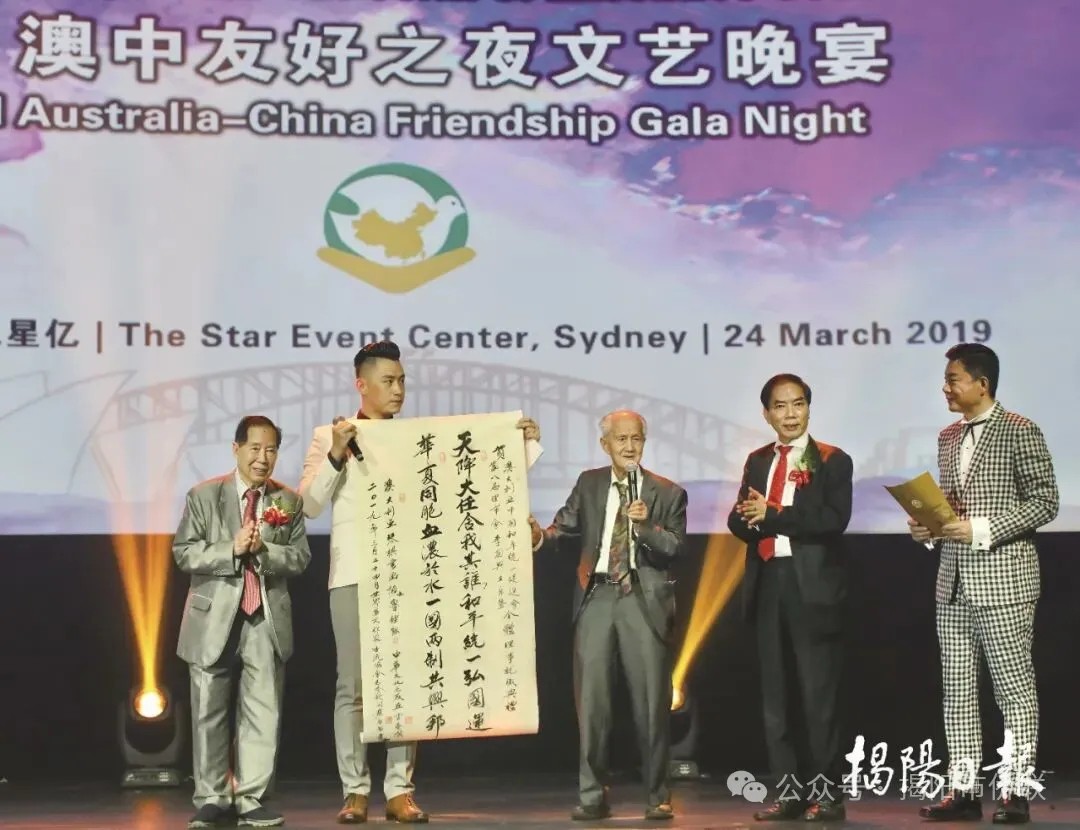 2019年,李国兴当选澳洲中国和平统一促进会会长。图为李国兴(右二)主办的澳中友好之夜文艺晚宴场面。
